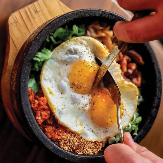 The breakfast rice arrives in a hot Korean stone bowl known as a dolsot. The rice crisps up over time and commingles beautifully with the other accoutrements: bacon, andouille sausage, eggs, cilantro and sweet soy.