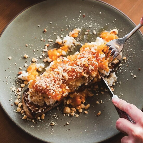 One of my favorite morning eats is eggs cooked in some sort of red sauce — shakshuka, eggs in purgatory, etcetera. Nonna Mercato's baked eggs are just that, but perfected. Delicate eggs, tangy tomato-red pepper stew, and goat cheese.