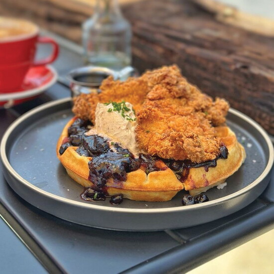 The chicken and waffles here are on another level. Buttermilk fried chicken. Blueberry compote. Cinnamon pecan butter. Maple syrup. Get it.