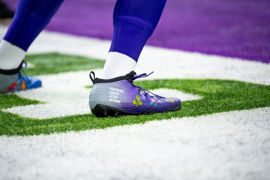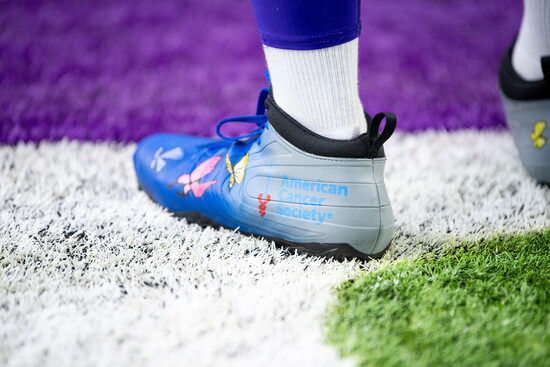 Fullback C.J. Ham dedicated his cleats to the Pancreatic Cancer Action Network, a cause that carries deep personal meaning after losing his mother to the disease. His design—a powerful mix of purple and silver—served as both a tribute and a reminder of the families still fighting.