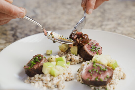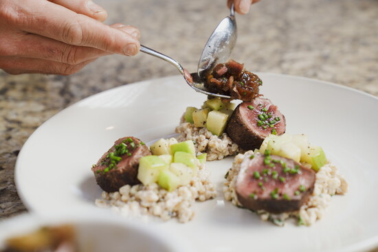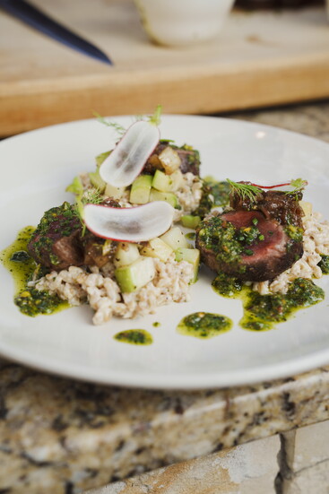During hunting season, wild game becomes central to the menu. “Pretty much every night we have some type of game,” Kennon says, pointing to pheasant and axis deer as favorites. Some guests arrive unsure about wild game, often because of a past bad experience. Kennon sees that as an opportunity. “They’ve had it before, but it was cooked improperly,” he says. “Then they try it cooked properly, and it changes their mind.” Even with his Pacific Rim background, he is mindful of his audience. Hunting-season guests often want comfort—“the big steak… a potato”—so he introduces new flavors carefully, letting small touches add interest without saturating familiarity.