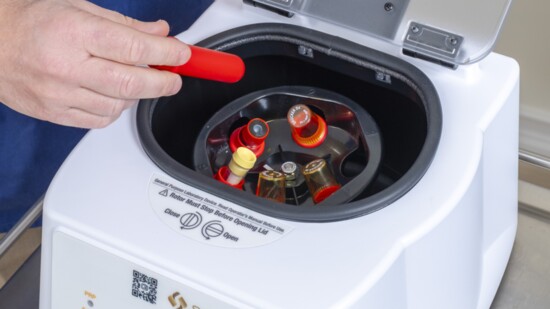 For such an effective procedure, the entire process is rather simple. First, Andy draws about 15 milliliters of blood. The vials go into a centrifuge, spinning at a rate of 3,500 revolutions per minute. In under ten minutes, the platelets are isolated, leaving 3-4 milliliters of “liquid gold”—plasma, the liquid portion of our blood, plus platelets, a type of blood cell that plays an important role in healing. This solution is drawn up into a syringe, then injected into the target area.