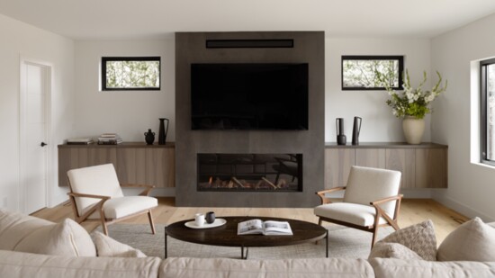 “We integrated a sleek and modern Ortal fireplace in the sitting room with floating millwork extending from the modern hearth,” shares Kate. “We collaborated with the Denver-based luxury brand, Vonmod, for all custom cabinetry that provided a functional beauty to each space.” High-quality materials, such as sintered stone countertops and book-matched slabs, were chosen for their durability and timeless appeal, ensuring a high-performing home that feels as good as it looks.