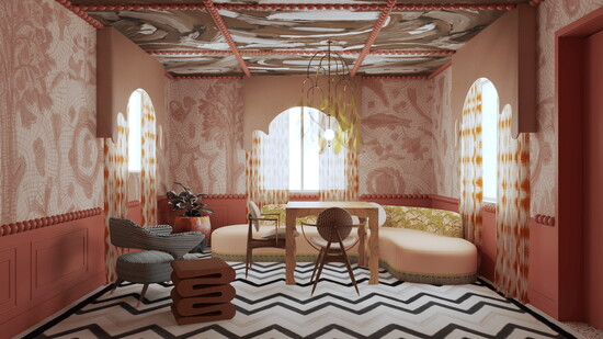 Entertaining soon reasserts itself. In The Royal Retreat by Lisa Erdmann Interiors, inspired by Mustique and Princess Margaret, the atmosphere turns more decadent. Vibrant tropical wallcoverings, bamboo trellis detailing, English antiques, and a well-appointed bar set the stage for evenings that stretch late, when music fills the room and the carpet becomes a dance floor.