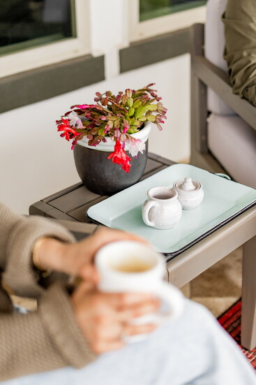 "The final and most important thing was adding plants," Kemnitz explains. "We wanted flowering plants that would add some color, and we had two blank walls that we wanted to act as a backdrop to plants that could double as art.” So she consulted with the experts at Hill Country African Violets and Nursery, who suggested a climbing rose and a mandevilla. By training them up trellises, the plants became a vibrant, ever-changing mural. A beautiful hibiscus was added to act as a mini-tree, grounding the space. "It’s now a favorite place for Matt and me to have a cup of coffee or talk while watching the sunset.”