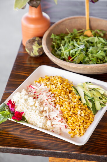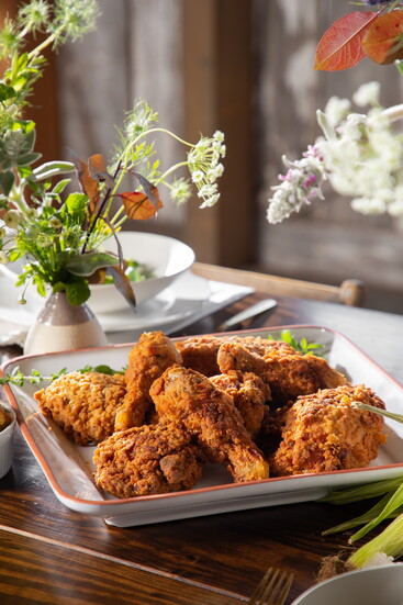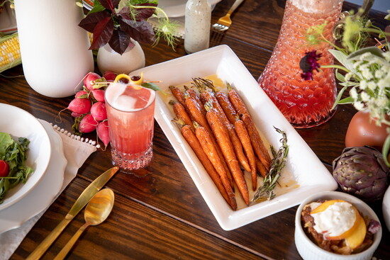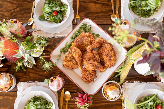 This dinner starts with an Arugula Salad with Grilled Corn, Shaved Radishes with Zucchini and Goat Cheese and served with a Creamy Lemon Vinaigrette. Buttermilk Brined Fried Chicken pairs nicely with Roasted Heirloom Carrots drizzled with Hot Honey. Peach Bread Pudding with Salted Caramel Cream rounds out the meal for the perfect sweet treat.
