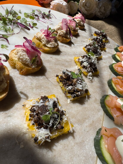 “Some of the most popular offerings include curated grazing tables and boxes, elevated appetizer service for receptions and cocktail-style events, wedding catering, private chef dinners and corporate gatherings,” Anna shares. The elevated appetizer service, in particular, is a standout for clients who want movement and mingling rather than a traditional seated dinner. “The elevated appetizer service is especially popular for clients who want an interactive, refined experience that encourages movement, conversation and variety while maintaining a polished presentation.”