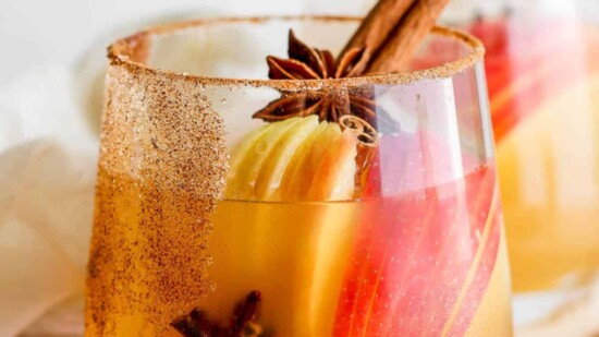 Garnish with apple slices, star anise, and a cinnamon stick.