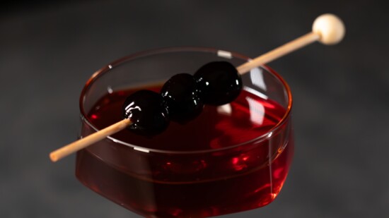 Stir ingredients together with ice and strain into a martini glass. Garnish with a maraschino cherry.