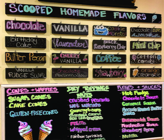 The ice cream is made fresh daily on Italian Carpigiani machines using milk delivered twice a week from a 300-farm co-op in upstate New York, where the milk is higher quality than anything they’ve found at other farms. Scooped’s ice cream is rich, smooth, and full of flavor with a high 14% butterfat content. The shop rotates among more than 100 recipes, keeping 16 flavors in the case at a time. Staples like chocolate, vanilla, and mint chip sit alongside all-time favorites such as “Monster” (blue vanilla with cookie dough and Oreo) and seasonal specials like pumpkin pie or blueberry swirl.