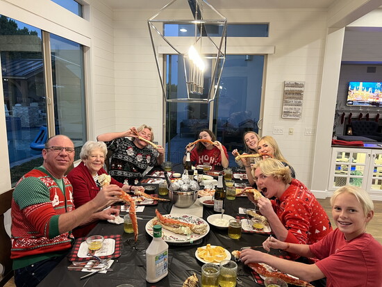 On Christmas Eve, the family enjoys a seafood dinner of crab legs and shrimp with the kids and Granny, followed by watching videos of Christ’s birth and reflecting on the true meaning of Christmas. Christmas morning begins with a family photo on the stairs, kids and the dog in matching pajamas, before everyone excitedly discovers what Santa brought.