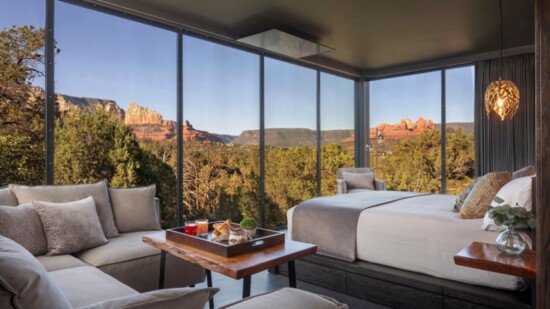 I arrived at Ambiente® Sedona, a luxe new “landscape” hotel just off the “Y,” Sedona’s busy main intersection. After being greeted with a glass of bubbles, I’m whisked to my Atrium, one of the property’s 40 elevated glass-shrouded stand-alone structures built above and alongside a flowing creek. Each Atrium is built into the landscape, rising and falling with the rocks. The property is barely visible from the highway, thanks in part to rust-colored rooftops that mimic the surrounding Brins Mesa mountains. The red rocks of Sedona are reflected brilliantly on the bronzed glass of each Atrium.