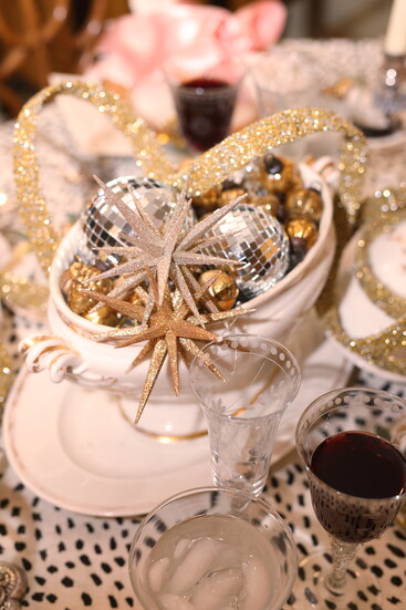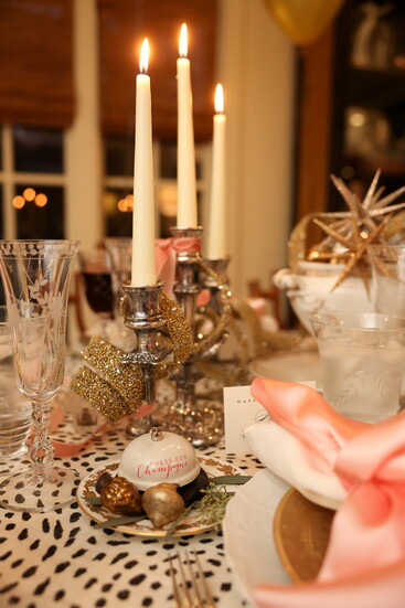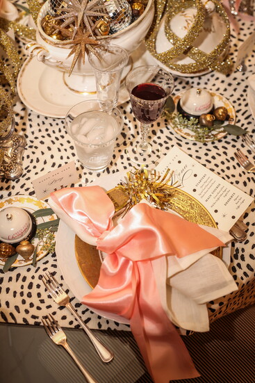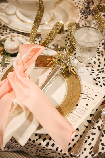 Their latest table design captures exactly that spirit. “Our theme here is obviously New Year’s Eve,” Rebecca laughs. “We found these cute little ‘ring for champagne’ bells, and it all started from there. Mary Carol saw them and said, ‘Oh, I want that at my place setting!’ So, we built the whole table around that playful touch.”