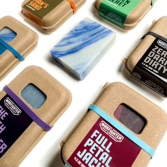 (3) Warfighter Wax Co. is a local veteran-owned small business specializing in small-batch soy wax candles and natural soap bars. The company's playful military branding, tropical themes, and subtle sarcastic undertones are juxtaposed with its real-world focus on sustainability, American manufacturing, and generosity toward military and first responder-centric organizations.