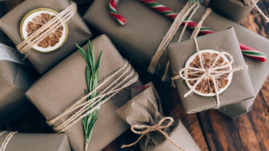 Holiday gift wrapping does not have to be elaborate or even expensive. Simply using brown kraft paper or recycling brown paper bags can be the base for gorgeous gift wrap. Gift tags can be as simple as a piece of cardboard cut into a fun shape, such as a Christmas tree or star… or just a simple square. Ribbons can be ones you have on hand or simple natural or dyed twine tied around sprigs of evergreen, dried flowers, mini grapevine wreaths or even pinecones.