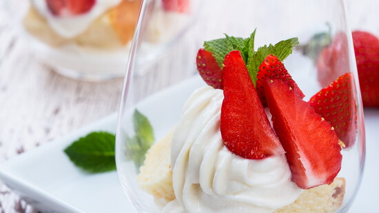 Place a slice of cake on a pretty plate, or a cute glass, add a spoonful of whipped cream, and top with strawberries. Garnish with fresh mint leaves.