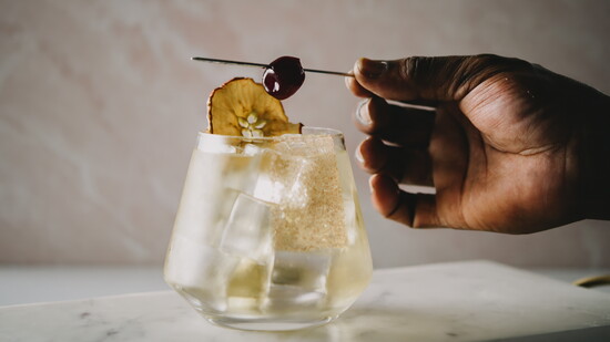 - Garnish with a skewered bourbon-soaked cherry and a dehydrated apple slice.