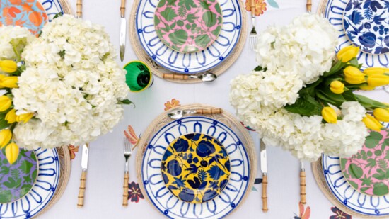 One of the key summer entertaining trends Blue Print’s designers are noticing is the fearless mixing and layering of patterns, colors and textures. “No need to put too much focus on pairing things that ‘match’ perfectly,” the designers say. “Don’t let the little voice in your head keep you from trying something unexpected. Some of the best tablescapes we’ve created have come as a result of much trial and error, and very unexpected pairings!”