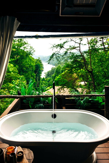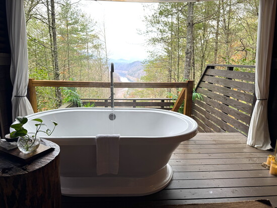 Ninety minutes in a bath sounded like a lot to me before my treetop soak in a private cabana at Lakeview at Fontana near Bryson City, NC. After a short but steep hike up a forested trail from the unmanned reception lounge (“Unplug. Unwind. Unhosted.” is Lakeview’s tagline), I found my cabana, a tiny mountain cabin open to the elements on one side. While I ran the bath (plenty of hot water), I used the loo (not open to the elements), changed into a fluffy robe and stepped down onto my private deck to take it all in. The view from the deck and tub reached the Great Smoky Mountains across Fontana Lake, with nary a human in sight. The experience was nurturing and heart-opening, bathing in the quiet embrace of the surrounding forest while soaking in an oversized tub built for two, a luxury for one. Soaking in a hot tub in the middle of the woods is multi-sensory therapy.