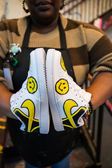 At the Griffins’ South End studio, people can commission custom sneakers or participate in workshops to design a pair. Workshops are open to all ages, and participants supply their own shoes.