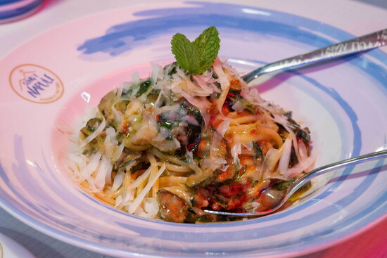 The pasta list features five dishes, two with Campania roots. Spaghetti Nerano, from a small town near Naples, arrives under a generous topping of shredded cheese and sautéed zucchini. Paccheri Genovese, despite its name, is a Neapolitan classic with a rich veal and onion ragu and Parmigiano Reggiano.
