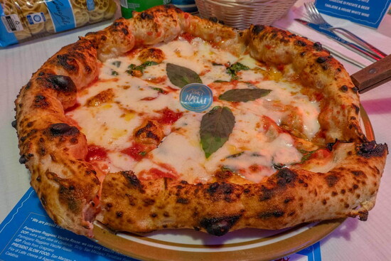 The top-selling margherita pizza is made to strict Neapolitan standards: a thin crust with a puffy outer edge, baked at about 850°F for 90 seconds. The center is too soft to fold, so locals are encouraged to eat with fork and knife. Balanced flavors define it — sweet but restrained tomato sauce and mild, salty Fior di Latte mozzarella. For a crunchier option, try the montanara, or fried pizza.