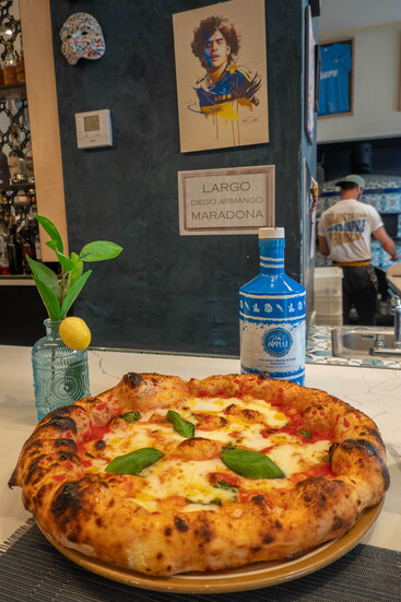 The 47-seat dining room has an open kitchen where diners can watch pizzas cook in a gas oven imported from Naples. Most ingredients — along with the pizzaiolo, music, and even some staff — come from Southern Italy. The décor pays homage to Naples, from Pulcinella masks to Diego Maradona memorabilia, with six framed jerseys above the kitchen.