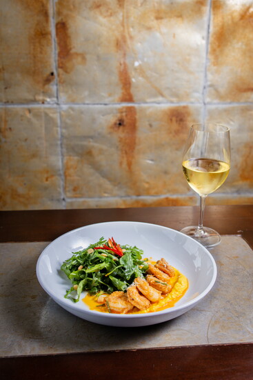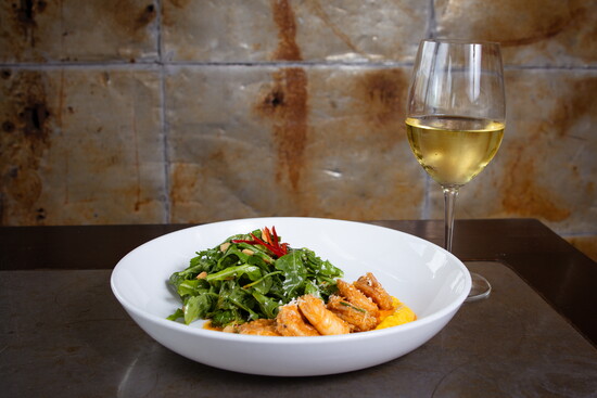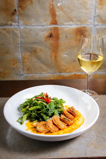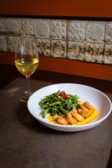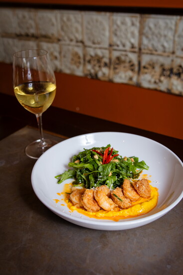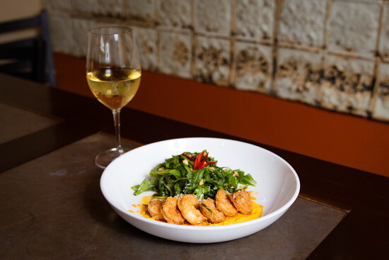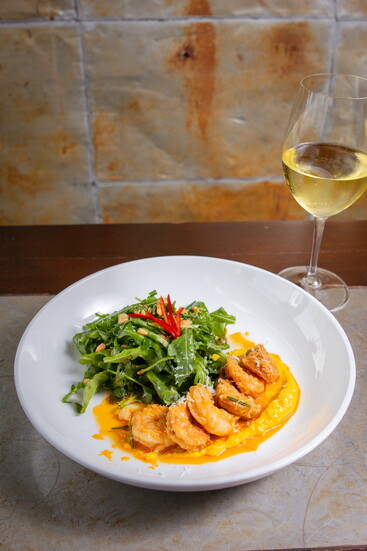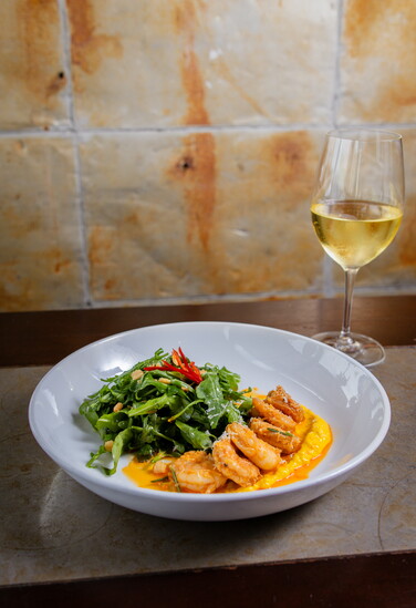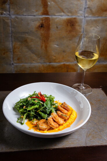 Marinate shrimp for 2-4 hours. Cook in a hot pan to a slight char. Flip after 4 minutes, reduce to medium heat, and cook for 5 more minutes. Deglaze with white wine. Chill shrimp.