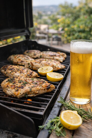 In a large bowl, whisk together Mexican Lager from Frontyard Brewing, olive oil, lemon zest and juice, garlic, rosemary, thyme, salt, and pepper. Add the chicken breasts, turning to coat evenly. Cover and refrigerate for at least 2 hours, or overnight for deeper flavor. Remove from the refrigerator about 20 minutes before grilling to allow the chicken to come closer to room temperature for more even cooking.