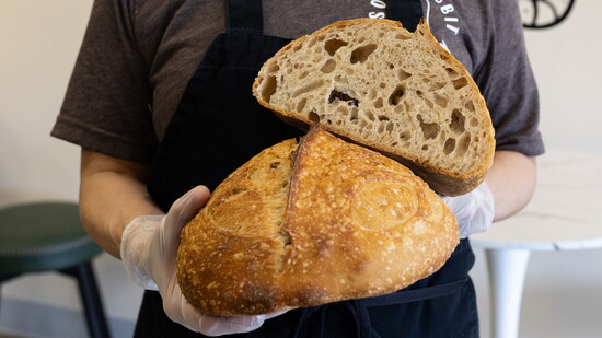 Inside the bakery, a mural painted by local Mexican artist Socorro Reyes Ramírez features Atsuko’s own drawing: two rabbit ears and a pair of eyes. It’s the bakery’s logo, and it captures the whimsical yet deeply personal nature of the business. The name, Sour Rabbit Bakery, was inspired by the sourdough starters Atsuko uses—one made from wheat flour, another from Japanese sake—and the rabbit, her favorite animal, and her birth sign in the Japanese zodiac.