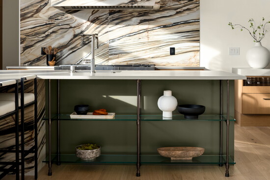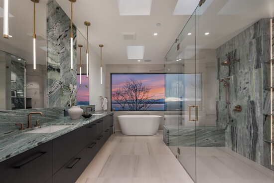 The primary suite elevates the experience even further. A skylit corridor leads to a bath wrapped in hand-fluted, green marble tile, threaded with subtle gold veining. It is both dramatic and serene, leaving a lasting impression on nearly everyone who enters.