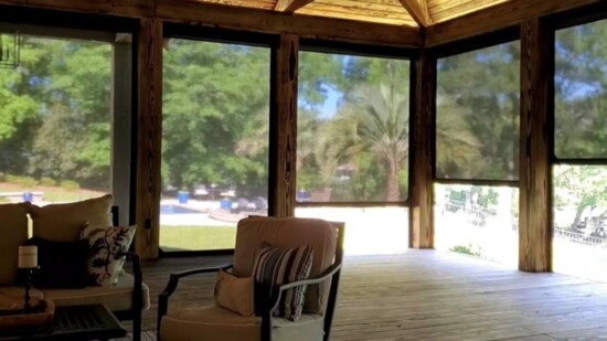 In addition to providing privacy, roller shades and screens are customized in percentage of gradient that can be made to block up to 97% of UV rays, making outdoor living areas significantly cooler in the summer. Those same spaces also become usable year-round with additional climate control items such as portable heaters for cold weather. Shades can be as large as 12 feet tall and 16 feet wide. The motorized system allows for up to 15 different shades on one remote.