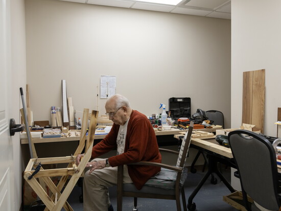 Here, he builds ships, airplanes, and trains. While most of the models stay in his room, he sometimes puts them on display at the center. Now, he is finishing up a special chair that he can use for his musical performances. “It's a folding chair that converts into a handcart, and that way I can carry the accordion to where I’m playing and then open the chair to sit. It has no arms and is the right height.”