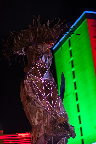 Beyond illuminated festivals, Reno’s year-round outdoor installations give us landmarks, stories, and meeting places. Many in Reno can picture their favorite statue downtown. Mine is a Reno classic, the Space Whale. Giant sculptures like the famous Space Whale or the iconic word sculpture BELIEVE at City Plaza provide visual anchors downtown that are somehow familiar yet awe-inspiring. Many pieces originated at Burning Man, but found lasting homes here, merging Reno’s urban identity with its creative heritage. Others are commissioned by The City of Reno like the large, abstract piece made of stainless and Cort-ten steel along the roundabout at the intersection of Virginia, Mary, and Center streets (pictured).