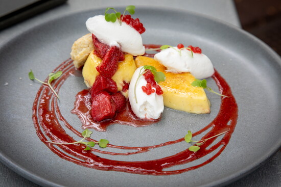 Wine Kitchen – Strawberry Shortcake Crème Brûlée The Wine Kitchen’s Strawberry Shortcake Crème Brûlée is elegance served with a wink of comfort food dressed in its Sunday best. Silky buttermilk custard hides beneath a caramelized sugar crust, its richness offset by roasted strawberry preserves that lend a bright, fruity tang. A tender sweet biscuit and a dollop of whipped buttermilk tie the flavors together, creating a dessert that’s as layered in taste as it is in texture. For a perfect complement, pair it with the Jack Rose—apple brandy, grenadine and lemon—which mirrors the dessert’s fruit-forward notes while adding a crisp, citrus lifting the palate for the next spoonful. TheWineKitchen.com