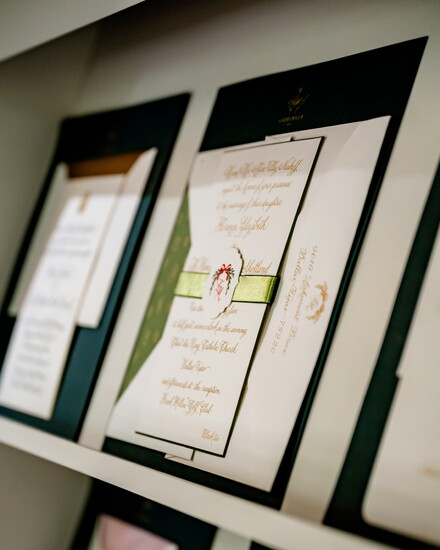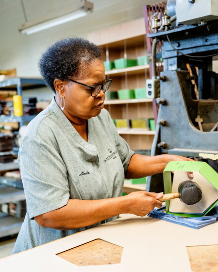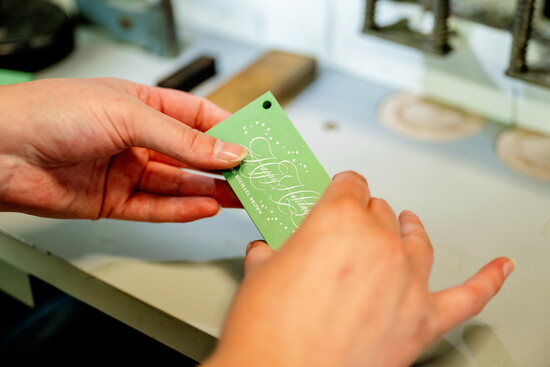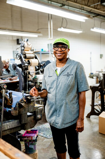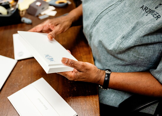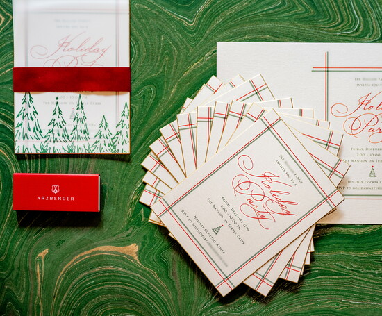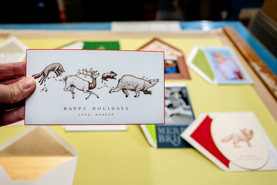 Dudley says there are about 50 engraving companies similar in size to Arzberger around the country, but only a handful offer an extensive list of boutique services like letterpress, blind embossing, die cutting, foil stamping and more. Arzberger customers can order holiday cards with printed photographs attached to custom-milled paper. A bride can get wedding invitations embossed with flowers from her veil or an artist’s rendering of their wedding venue on the liner of the envelope.
