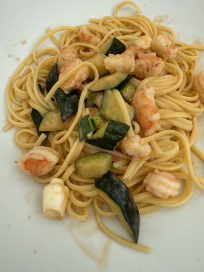 Taste: Linguine with scampi and zucchini in lobster sauce.
