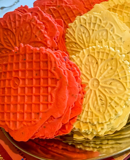 "As a Christmas tradition, Nana makes Pizzelles, an authentic Italian cookie in red, white, and green. She said it is time-consuming, but the pizzelle baker makes beautiful Italian snowflake cookies. It is a fragile cookie, so be careful taking them off the baker.
