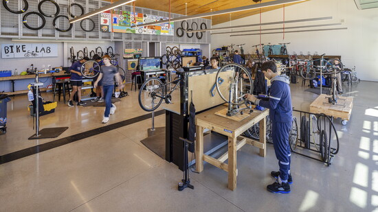 Thaden’s curriculum is designed to nurture curiosity and build a strong sense of civic engagement, exemplified in three signature CBL programs—Meals, Reels, and Wheels. These concepts bring learning to life through hands-on, interdisciplinary collaborations including culinary arts, journalism, and mechanics. Student experiences include using greenhouse work to better understand science and culture [Meals] or engaging humanities through film and photography [Reels]. Quintessentially Bentonville, the Wheels program leverages local bike trails and mechanics to practice math, physics, and urban planning.