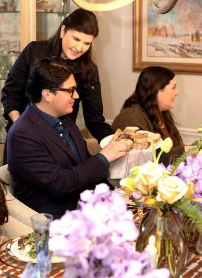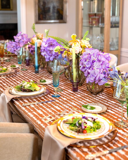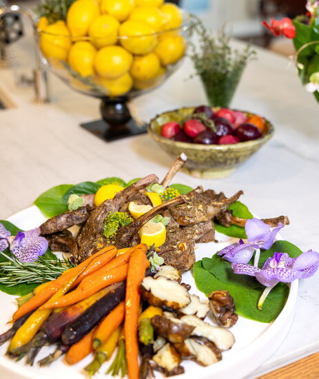 So when we decided to create a photo shoot to showcase her work, she curated an intentional guest list. Those around the table were treated to a Chef Toni menu featuring Champagne (of course) and a salad of baby spring Romaine lettuce and baby colored beets, miniature heirloom radishes, baby tomatoes and Persian cucumbers, drizzled with Nostimo Olive Oil and balsamic fig vinegar. Next, baby spring lamb marinated in seasonings including Greek oregano, Nostimo Olive Oil and lemon juice was served Grecian style with heirloom spring baby carrots and Jerusalem artichokes.