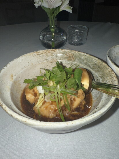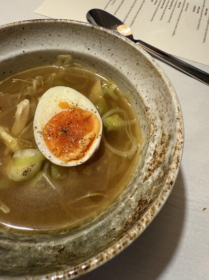 This past October, I had the pleasure of sitting down for an intimate dinner experience in the hotel’s elegant main house. Here, Chef Dewa welcomed us for a curated 10-course Indonesian tasting menu, a feast inspired by his home country. While a menu of this magnitude might overwhelm most diners, every course was crafted with a focus on freshness, balance, and nourishment, leaving us energized rather than overfilled. The meal began with a delicate chicken soup, brimming with complexity and comfort.
