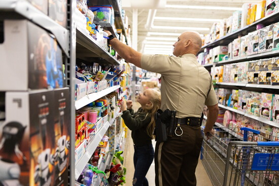 Scenes like that unfold everywhere you look: an officer kneeling to help tie a child’s shoes, a firefighter crouched low so a little boy can whisper which toy is for his baby sister, a deputy quietly covering the few dollars a total went over without saying a word. Walmart associates wipe away tears as they help the process run smoothly, knowing they’ve witnessed something good in its purest form.