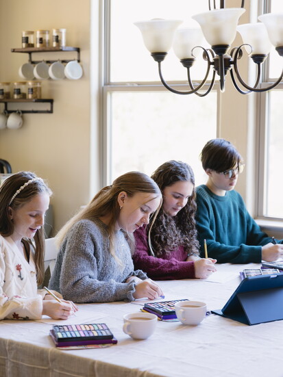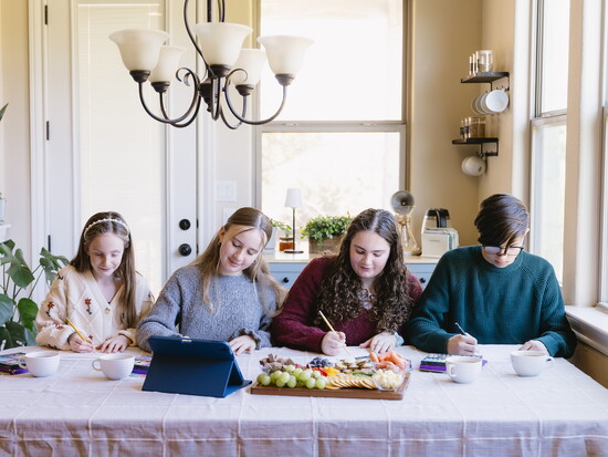 Their flexible schedule allows learning to happen anywhere: gathered on the couch, around the kitchen table, or outside on beautiful days.