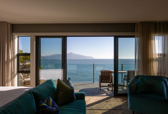 Inside, the Inn’s interiors echo the calming rhythm of the bay. Its 33 rooms and suites feature warm, natural materials, soft neutral palettes, and contemporary coastal décor that brings the outdoors in. Many offer fireplaces, deep soaking tubs, and wide glass doors that open to private balconies suspended above the water. The effect is soothing and cocoon-like: an atmosphere that feels designed for unwinding. Subtle artistic touches, elegant furnishings, and thoughtful lighting create a modern, understated sophistication without ever feeling formal or fussy.