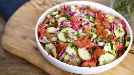 2. Put the onion, cucumbers, and tomatoes in a large bowl and season with salt and pepper.