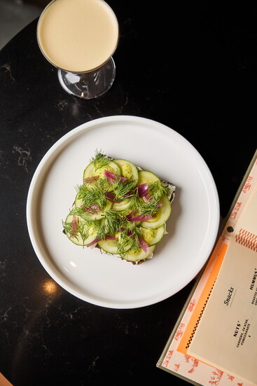 If the beautifully crafted cocktails are why you might have come to the Peach Crease Club, the music spinning in the background is why you will want to stay. The Peach Crease Club features a dedicated vinyl DJ booth where staff spin classic records throughout the night. It is unexpectedly refreshing to listen to a full record, to dive deeper into something you already love. These motifs continue to the menu, where subtlety and complexity blend to create a sense of nostalgia.