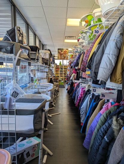 Because my kids are grown, I’m sort of relearning. There’s a whole lot more available than there was 20 years ago. Stuff is cuter, softer—even the tags are softer. Kids have sensitivities to different tags so we try to buy newer stuff that don’t have the harder tags that might irritate the back of their neck or backs. What I love about thrift shopping and being able to go to stores like mine—Once Upon a Child—is that you have every different style you can imagine. It’s not like going into a box store and knowing what style you’re going to find at that store. It’s everything from everywhere. If you are looking for a certain type, you can most likely find what you’re looking for because so many different people bring stuff in and the styles are endless. I love that families can come in and it can be a one-stop-shop a lot of times—you can find your shoes, your coat, your holiday wear, and maybe the kids find something that they can play with or a book—we have so many books. We have a lot of inventory, it’s very exciting.