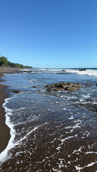 Jacó is known for its volcanic sand, darker and moodier than Caribbean white. It glimmers like charcoal when the tide pulls back. On the southern stretch, volcanic rocks scatter the shoreline, giving it character but making long barefoot walks less inviting. The northern end is smoother. Softer. Wider. The energy shifts. It's quieter, elevated, and still close enough to town.