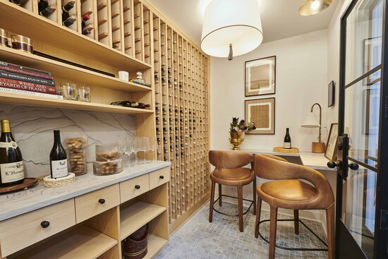 One of the most memorable spaces that followed was a small, unfinished area on the home's terrace level. The couple had always wanted a wine room, the wife was studying for her sommelier certification and dreamed of a place to store her growing collection. "I love taking a really small space and making it have a big impact," Trish says. She brought in her custom millworker to design floor-to-ceiling shelving, a temperature-controlled unit, glass doors, and a tasting corner. But the moment that sealed the room's personality came during planning.