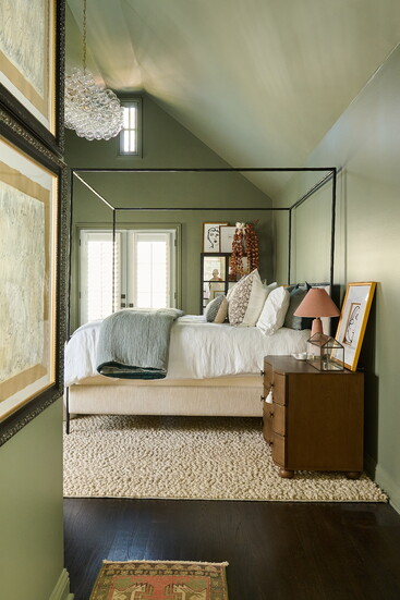 Upstairs, the primary bedroom offered an entirely different challenge. With high vaulted ceilings and vast empty walls, the room felt impersonal. Trish used one of her favorite techniques—color drenching—to transform it. "Painting the walls, trim, and ceiling the same shade added this cocoon feeling," she says. "Even a big room can feel warm and intimate." She grounded the space with a plush wool rug, layered in texture, and hung custom artwork from local artist, Lindsey Franks. The final touch was a bubbled glass chandelier so intricate that she, her assistant, and her electrician had to hang each bulb individually. "We won't forget installing that one," she says. "But it was worth every minute."